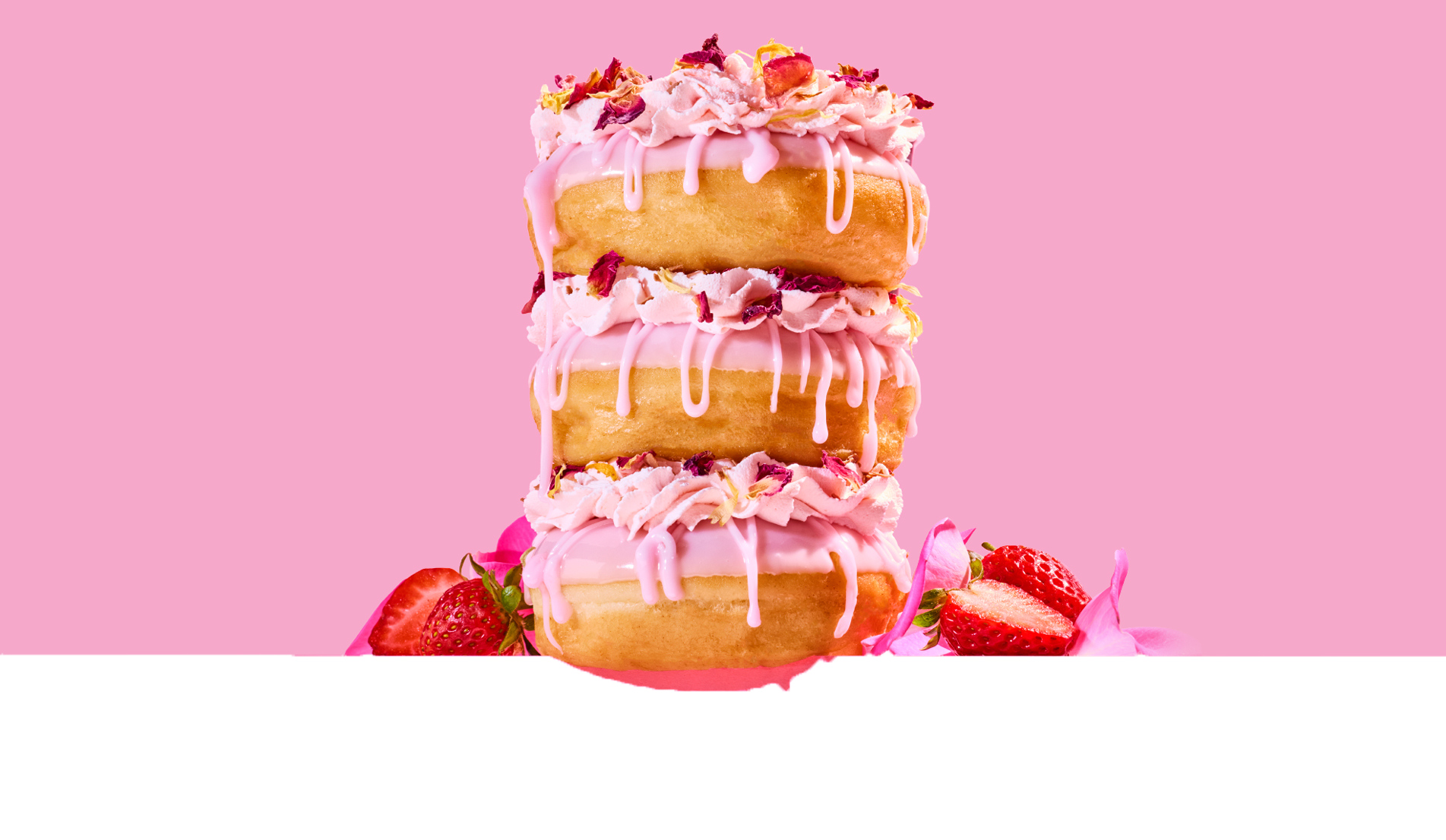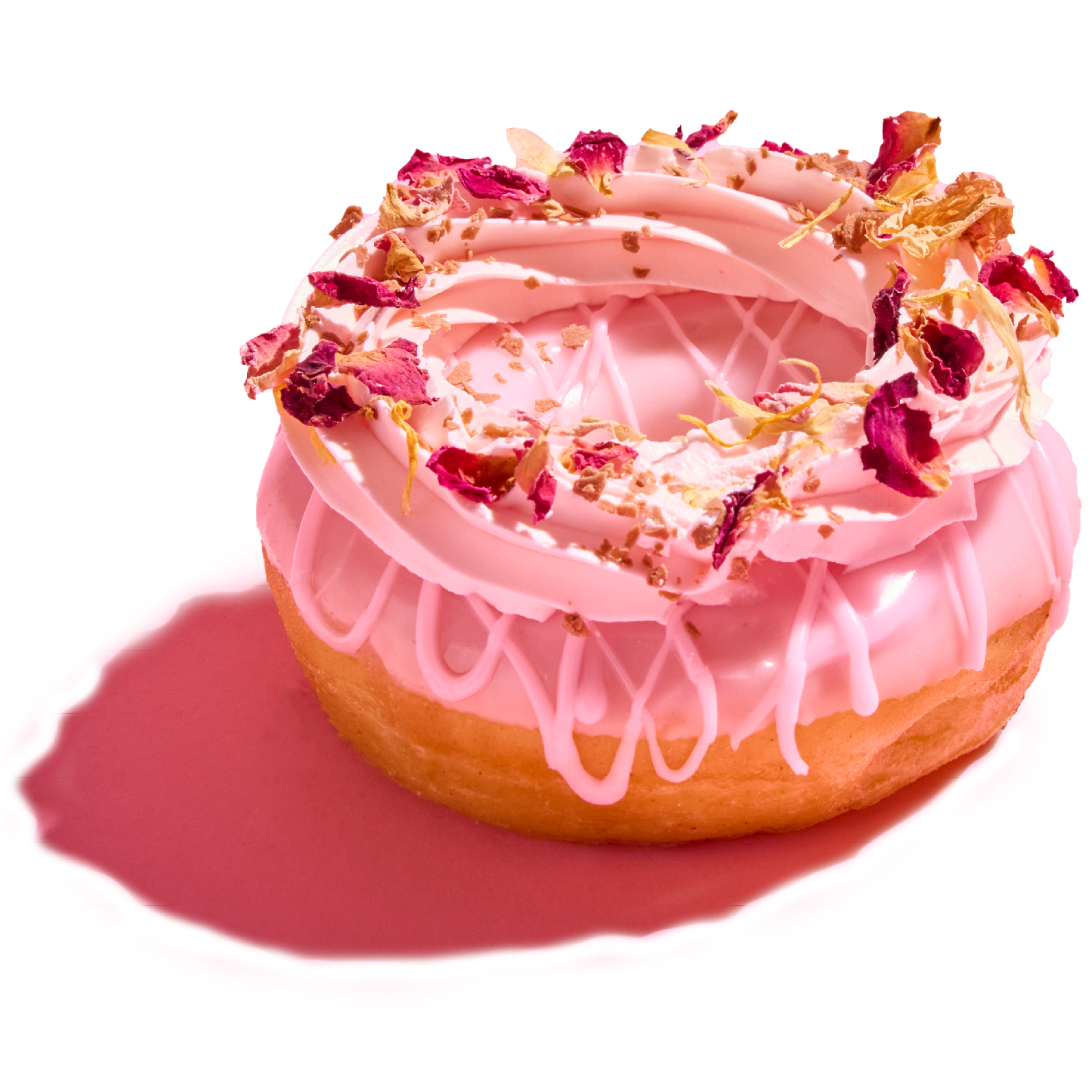 Dipped and drizzled in strawberries & cream fondant, kissed with rose cream, garnished with rose petals and chocolate flake.
